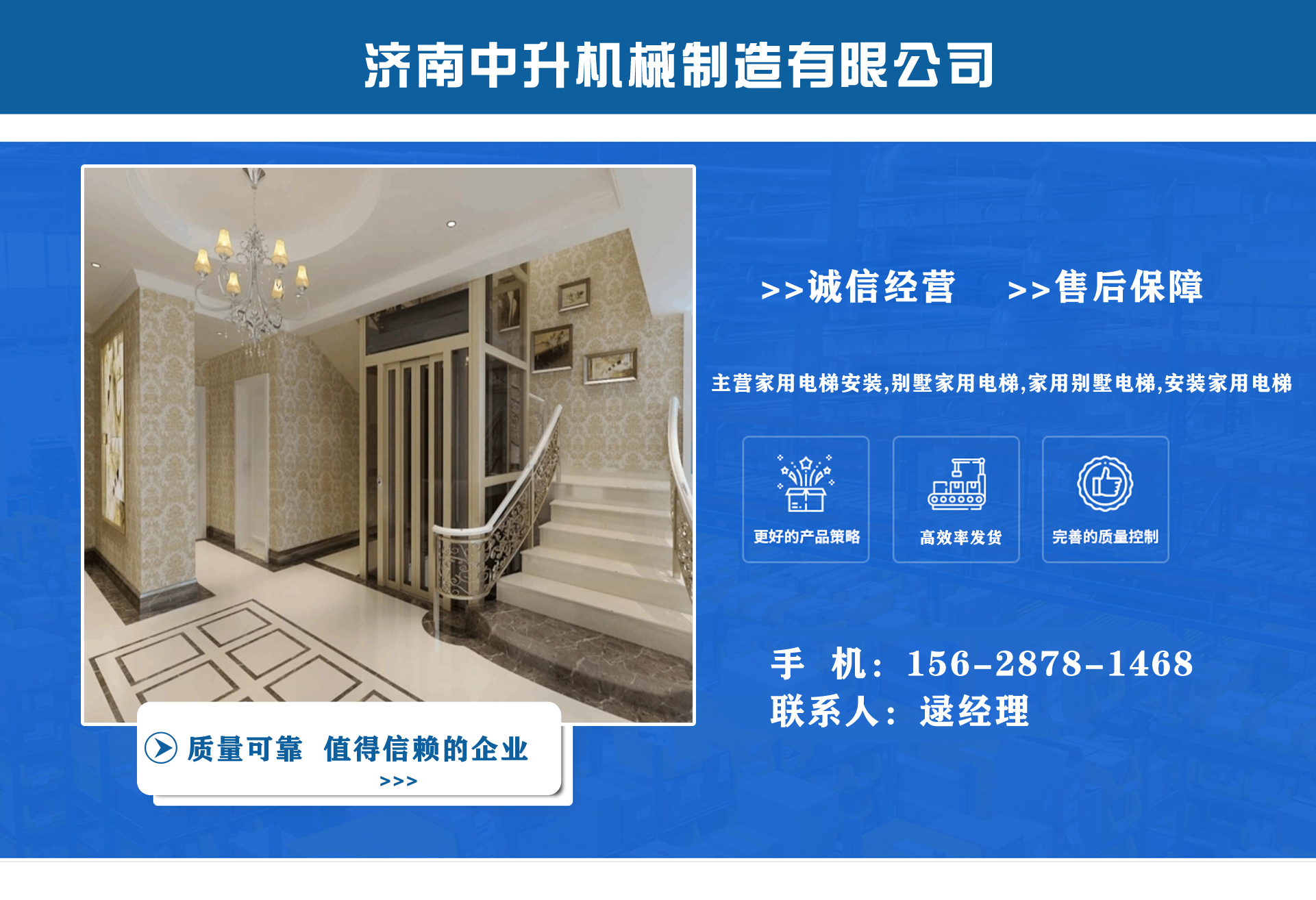 濟南中升機械制造有限公司主營家用電梯安裝,別墅家用電梯,家用別墅電梯,安裝家用電梯等業(yè)務(wù),質(zhì)量可靠,值得信賴! 公司為客戶提供免費上門測量,根據(jù)實際情況1對1服務(wù),保障符合用戶需求,終身提供售后服務(wù),讓用戶買的舒心用的放心。匠心團隊,打造信賴產(chǎn)品,我們有團結(jié)、奮進(jìn)拼搏的匠心團隊,為您提供可信賴的品質(zhì)保證。 從創(chuàng)立以來一直嚴(yán)格執(zhí)行質(zhì)量管理體系、環(huán)境管理體系等相關(guān)標(biāo)準(zhǔn)管理體系,“顧客滿意”是我們始終如一的追求。我們有屬于自己培養(yǎng)的安裝隊伍,24小時服務(wù)電話,為您提供可靠的服務(wù)與支持。 我們的愿景是建設(shè)國內(nèi)具有影響力的電梯公司,做城市美好空間的好伙伴。...